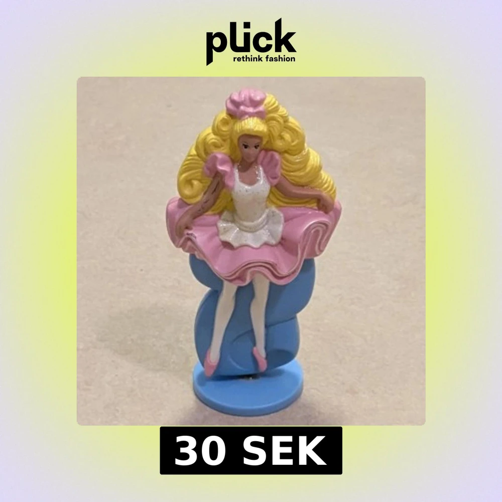 Barbie leksak från McDonalds av plast. Kan även användas som dekoration. Högra armen har ett mörkt sträck och även ett mindre mörkt sträck samt även en liten bit av kjolen har ett mörkt sträck