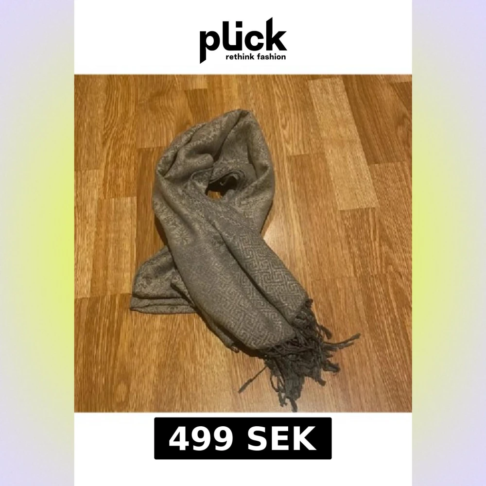 Snygg grå halsduk i 100% kashmir med diskret blommigt och geometriskt mönster. Mjukt material och fransar i ändarna ger en chill vibe. Perfekt att slänga över axlarna när det är kallt ute. Märkt med Pashmina-label. Se sista bilden en liten defekt som knappt syns