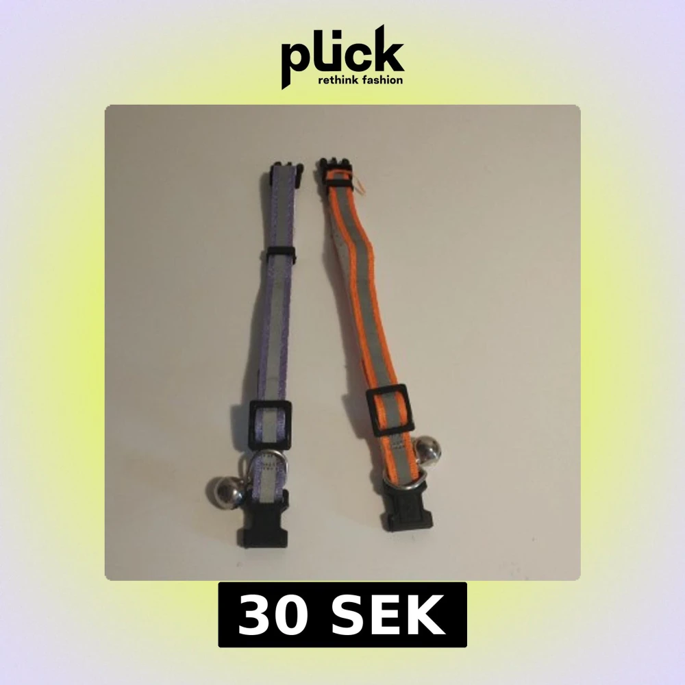 Säljer två justerbara halsband med bjällra, ett i lila och ett i orange. Båda har ett randigt mönster och är utrustade med ett svart plastspänne för enkel på- och avtagning. Perfekt för att hålla koll på ditt husdjur med stil.