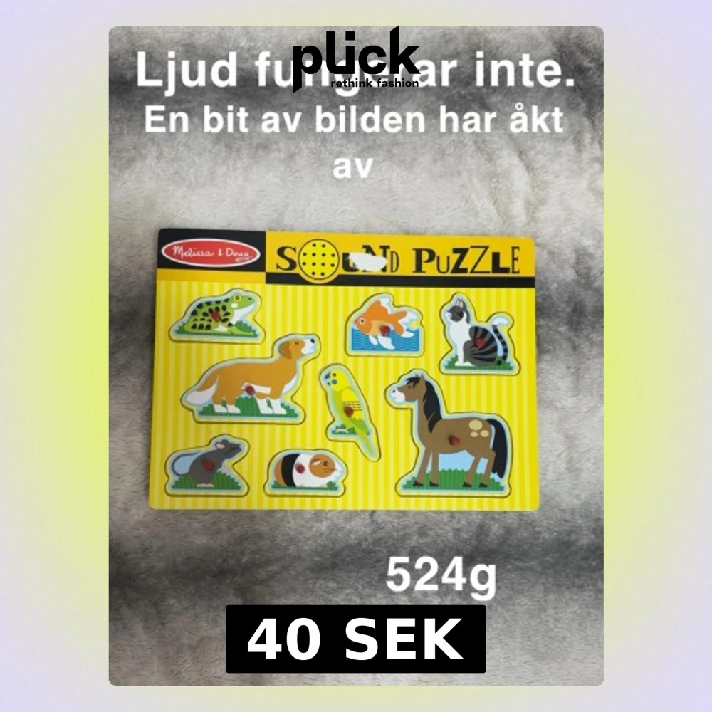 Säljer ett färgglatt djurpussel med gul bakgrund och åtta olika djurmotiv, bland annat häst, hund, katt, fisk och fågel. Pusslet har röda knoppar på bitarna och tydliga illustrationer. Perfekt för yngre barn som gillar djur och pussel.🌸 Ljudet fungerar inte. En bit av bilden är borta då dottern hade satt en namnlapp och när jag skulle ta bort den försvann även bilden under.