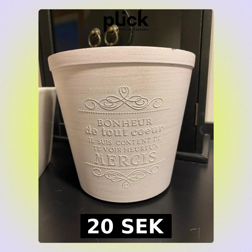 Plastkruka med text.