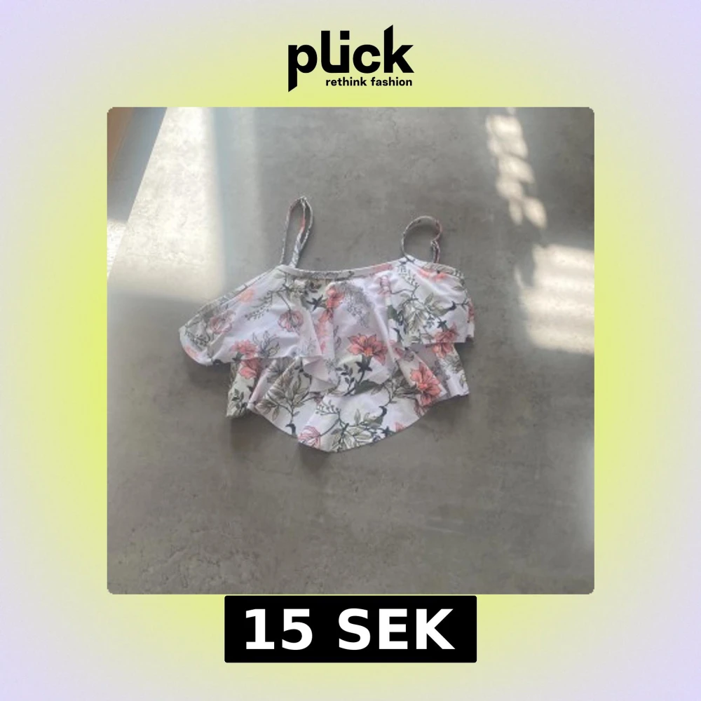 Säljer en söt blommig bikini överdel med volanger. Överdelen har justerbara axelband och ett vackert blommönster i rosa och grönt på en vit bakgrund. Perfekt för sommardagar!