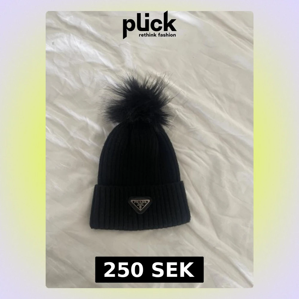 Säljer en svart ribbstickad mössa med stor fluffig pälsboll på toppen och ikonisk metallogo framtill. Mössan har bred uppvikt kant och är riktigt snygg till vinterlooken. Perfekt accessoar för dig som vill ha både stil och värme.