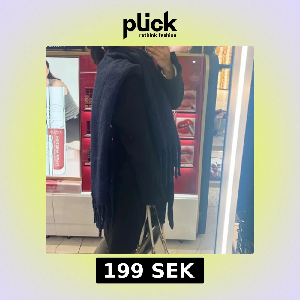 Säljer en stilren mörkblå halsduk med långa fransar. Perfekt för att hålla sig varm under kyliga dagar. Den har en enkel design som passar till många olika outfits.
