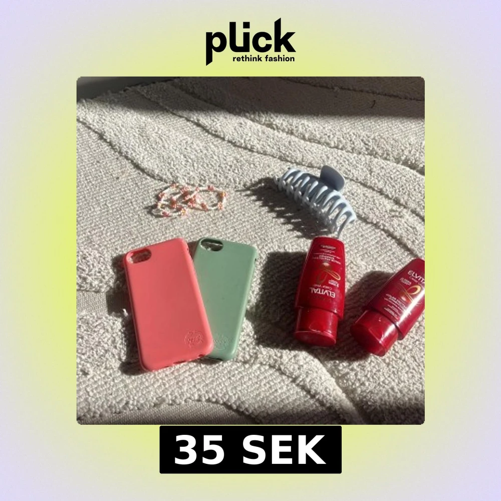 Ingen bok syns på bilderna, endast mobilskal, hårklämma, pärlhalsband och hårvårdsprodukter visas. Ingen information om någon boktitel, författare eller innehåll kan utläsas från bilderna.