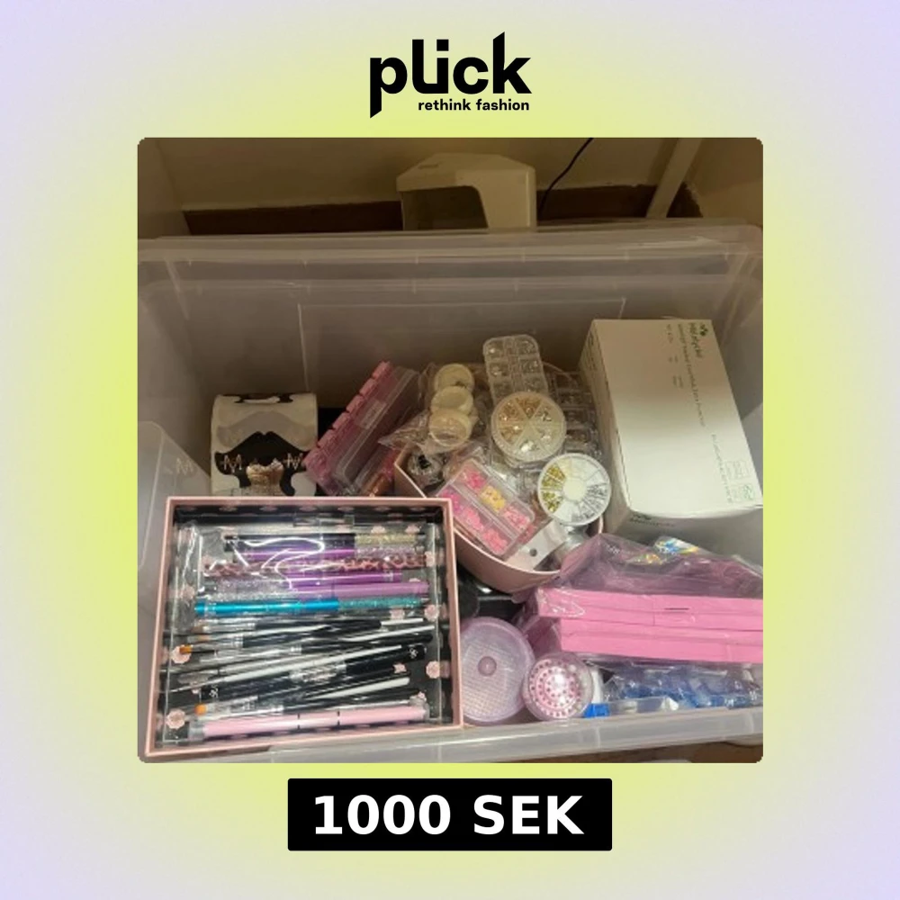 Säljer en stor samling av nageltillbehör. En hel låda fylld med glitter, dekorationer, engångsmaterial samt verktyg som går att sterilisera.