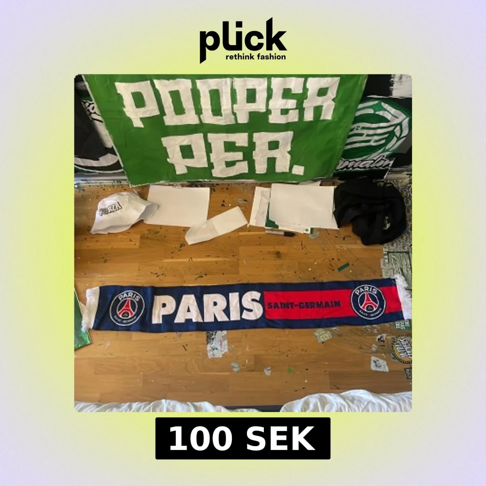 Snygg halsduk med Paris Saint-Germain logga. Ena sidan är blå med vit text och röd detalj, medan andra sidan är röd med blå text. Perfekt för att visa ditt stöd för laget!