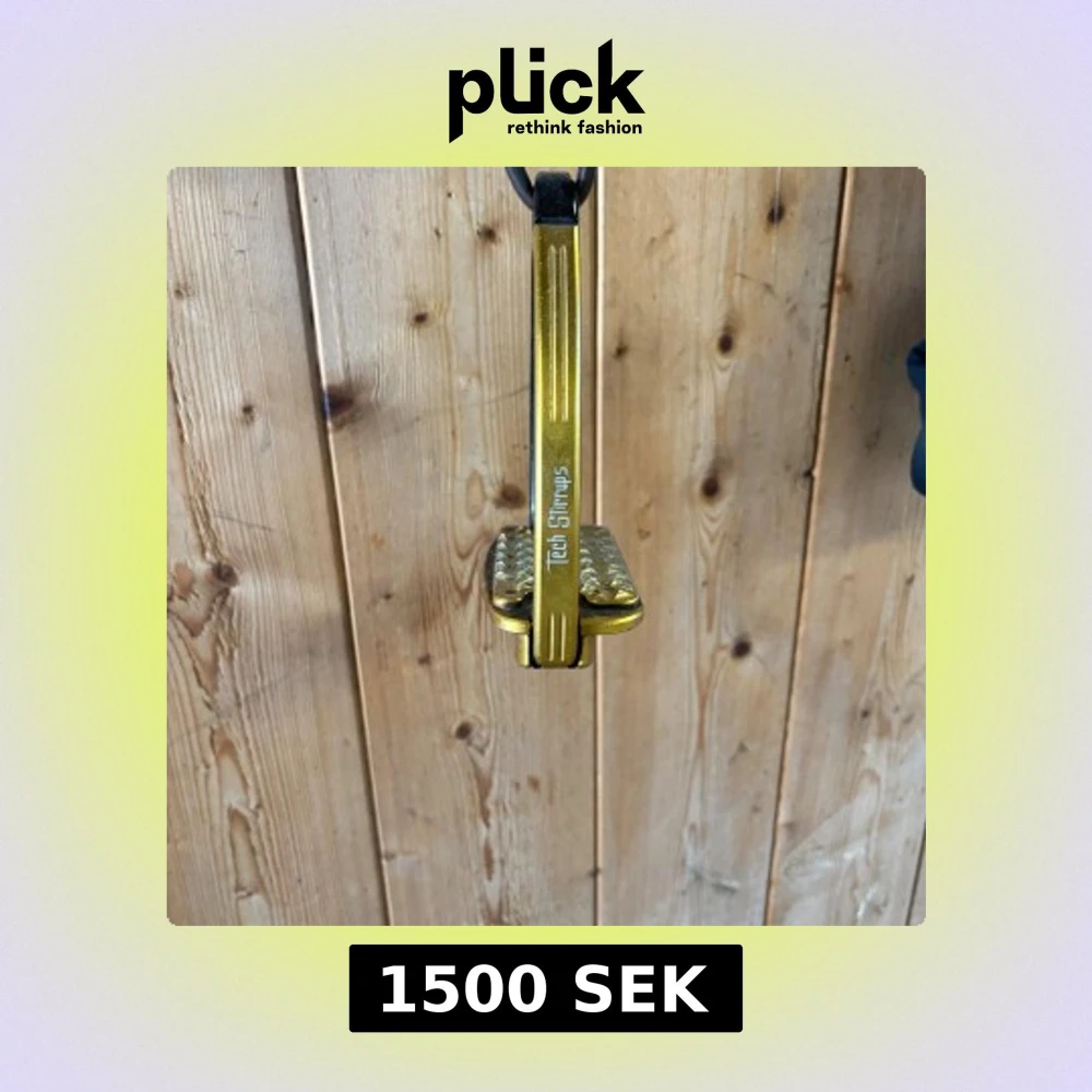 Snygga och robusta stigbyglar från Tech Stirrups i gul och svart aluminium. Ergonomisk design med greppvänlig fotplatta för extra säkerhet. Viss smuts och mindre slitage syns på fotplattan, men i gott begagnat skick och fullt funktionella.