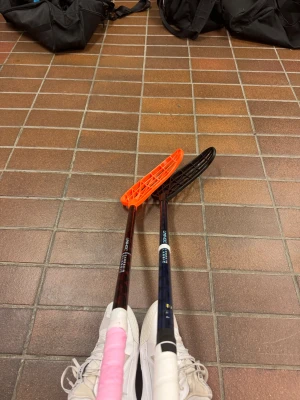 Ingen elektronikprodukt identifierad på bilden. Bilden visar två innebandyklubbor och ett par skor, inga synliga elektroniska enheter eller tillbehör.