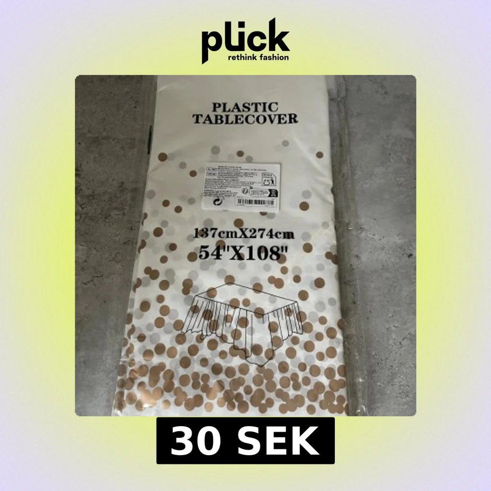 Två stycken nya plastdukar i förpackning, mått 137x274 cm (54x108 tum). Vit med guld- och silverprickar, perfekt för fest eller kalas. Oanvänd och i nyskick, skyddar bordet och ger en festlig känsla.