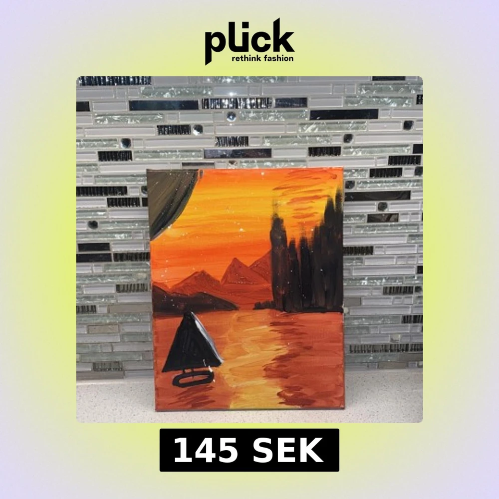 En färgstark målning som skildrar en solnedgång över en sjö med berg i bakgrunden. Himlen är i varma nyanser av orange och gult, medan vattnet reflekterar dessa färger. Silhuetter av träd och en segelbåt syns i förgrunden, vilket ger en känsla av lugn och stillhet.