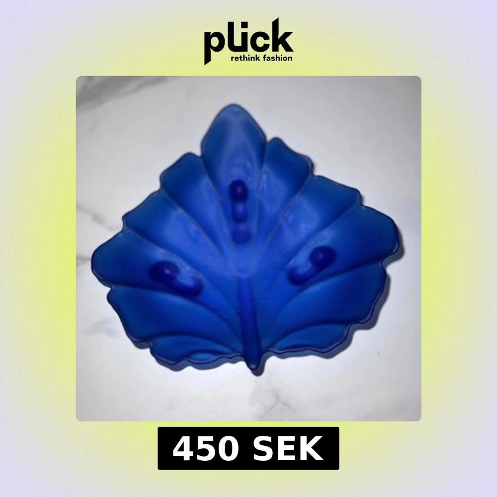 Detta är en blå glasskål i form av ett löv. Skålen har en matt finish och dekorativa detaljer. Perfekt som dekoration eller för servering av snacks och godis. Inga synliga defekter eller slitage. Unik och stilren design som passar i de flesta hem.