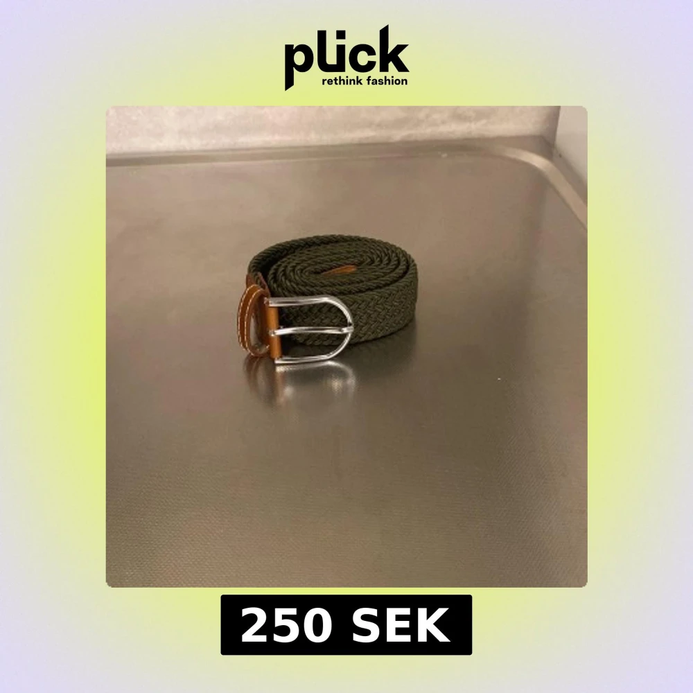 Snyggt grönt flätat bälte med detaljer i brunt läder och ett silverfärgat spänne. Perfekt för att ge en stilren touch till din outfit. Passar bra till både jeans och chinos.