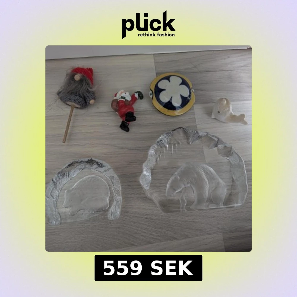 Bilden visar flera prydnadsföremål, bland annat två glasfigurer med djurmotiv (igelkott och björn), en tomte, en liggande jultomte, en liten val och ett runt föremål med blomdekor. Ingen bok syns på bilden.