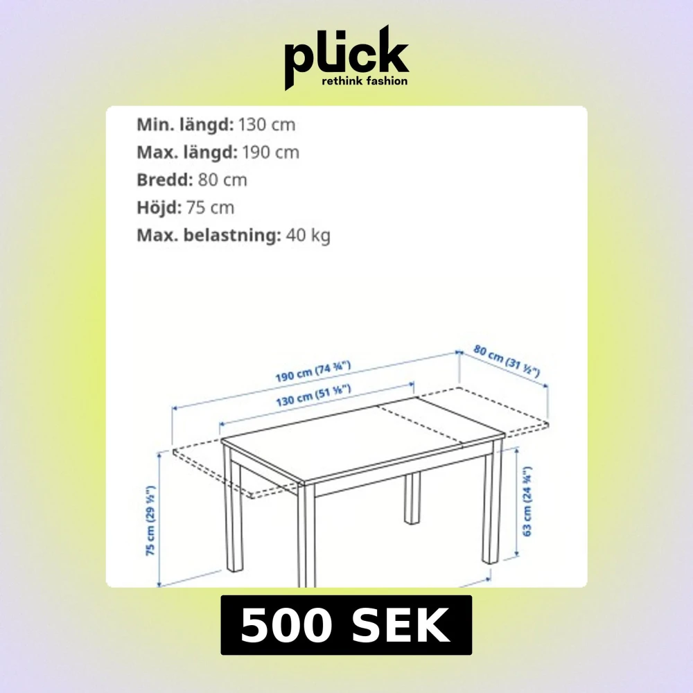 Stilrent vitt klaffbord med justerbar längd 130-190 cm, bredd 80 cm och höjd 75 cm. Perfekt för matplats eller arbetsyta, max belastning 40 kg. Bordet ser ut att vara i mycket gott skick utan synligt slitage.