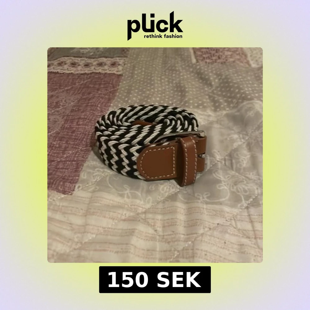 Snyggt flätat bälte i svart och vitt med bruna läderdetaljer och silverfärgat spänne. Perfekt accessoar för att lyfta din outfit med en modern touch. Bältet har ett randigt mönster och är gjort i syntetmaterial med läderdetaljer.