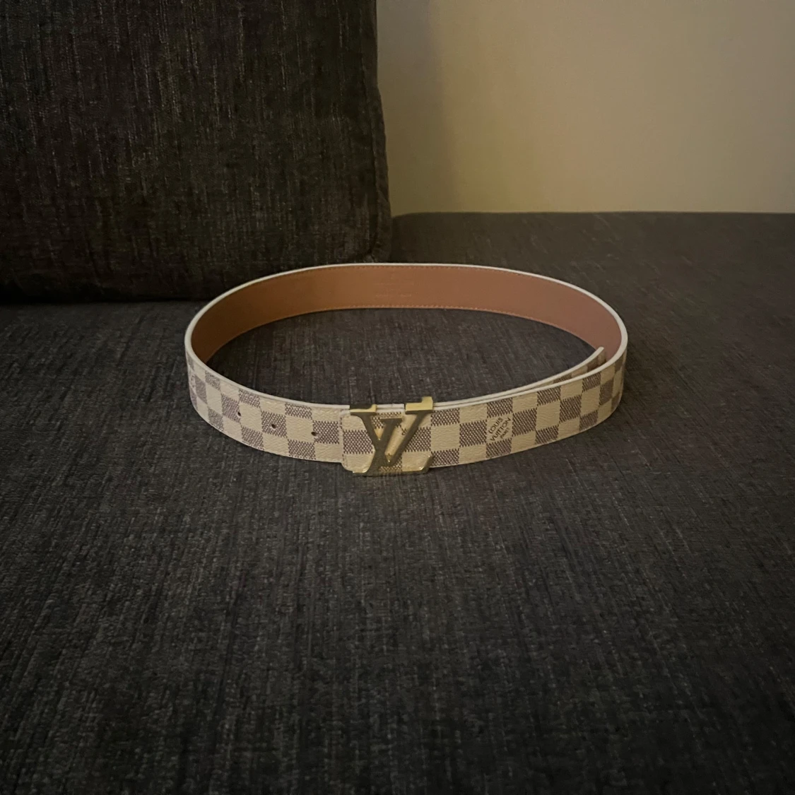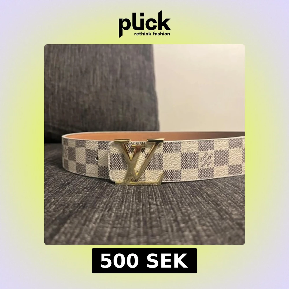 Säljer ett stilrent bälte från med klassiskt rutmönster i vitt och grått. Bältet har ett stort -spänne i guld och är gjort i skinn. Perfekt accessoar för att lyfta din outfit.