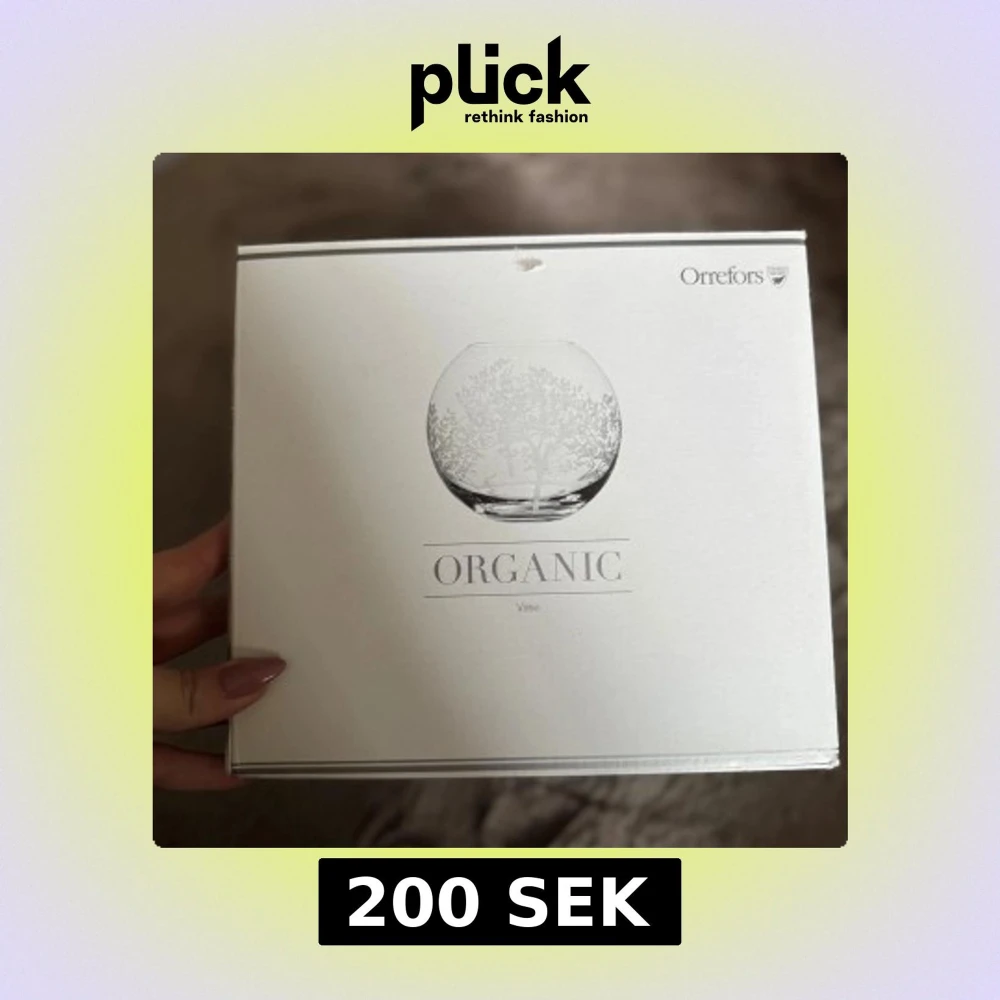 Elegant Orrefors Organic vas i originalförpackning. Glasvas med vackert trädmotiv, perfekt för blommor eller som inredningsdetalj. Produkten är oanvänd förpackningen har ett litet märke på ovansidan men är annars i gott skick.