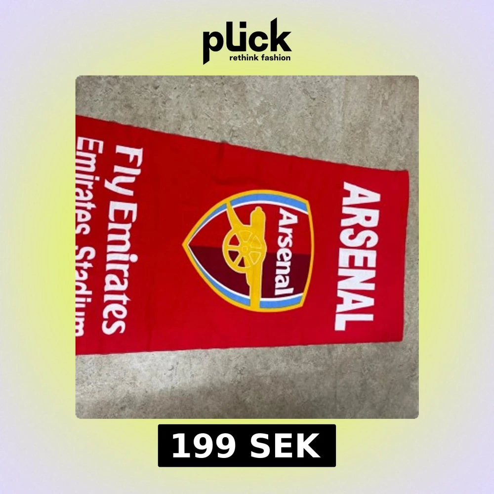 Stor röd halsduk med Arsenal-logga och texten 'Fly Emirates Emirates Stadium'. Tydliga vita bokstäver och klubbens klassiska kanon i gult och blått. Perfekt accessoar för alla Arsenal-fans som vill visa sitt stöd på matchdag.