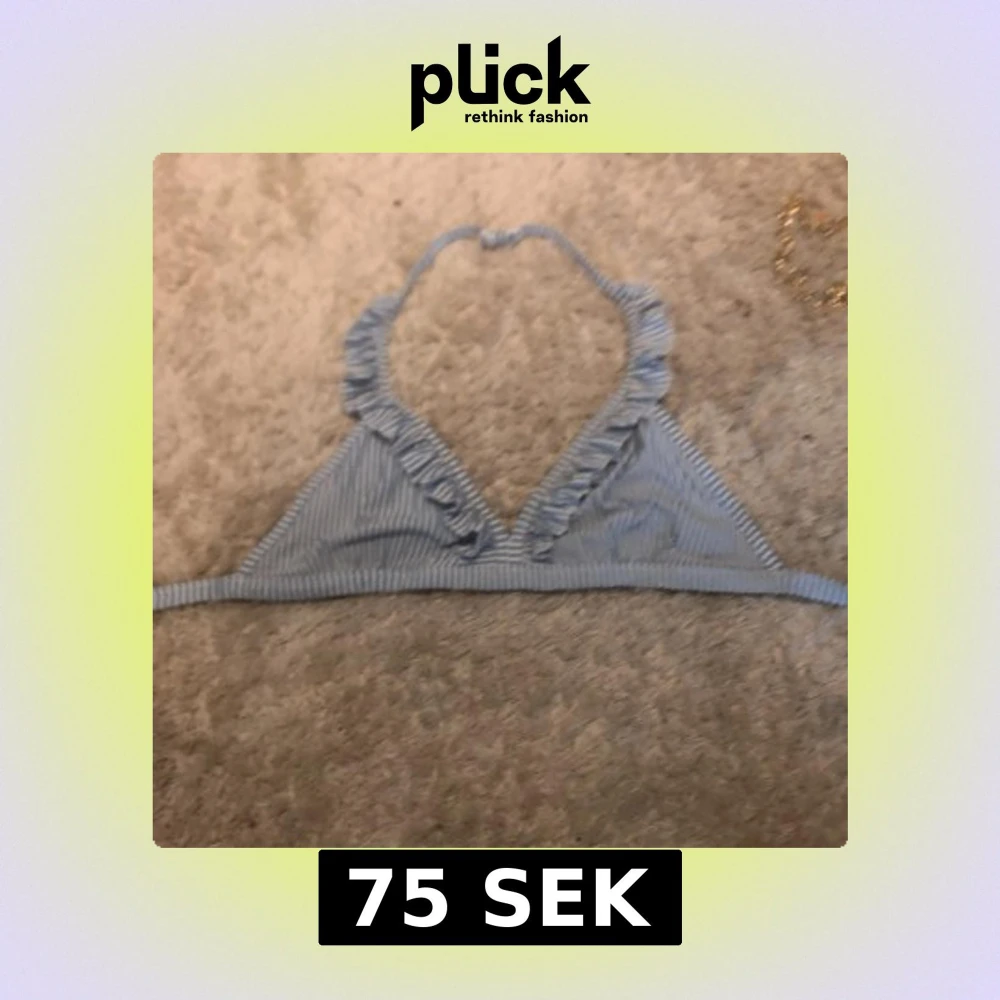 Supersöt bikiniöverdel i blått och vitt med smala ränder och volangdetaljer längs kanten. Triangelformad modell med knyt i nacken och praktiskt spänne i ryggen. Perfekt för strandhäng och poolparty i sommar! Materialet känns mjukt och stretchigt.