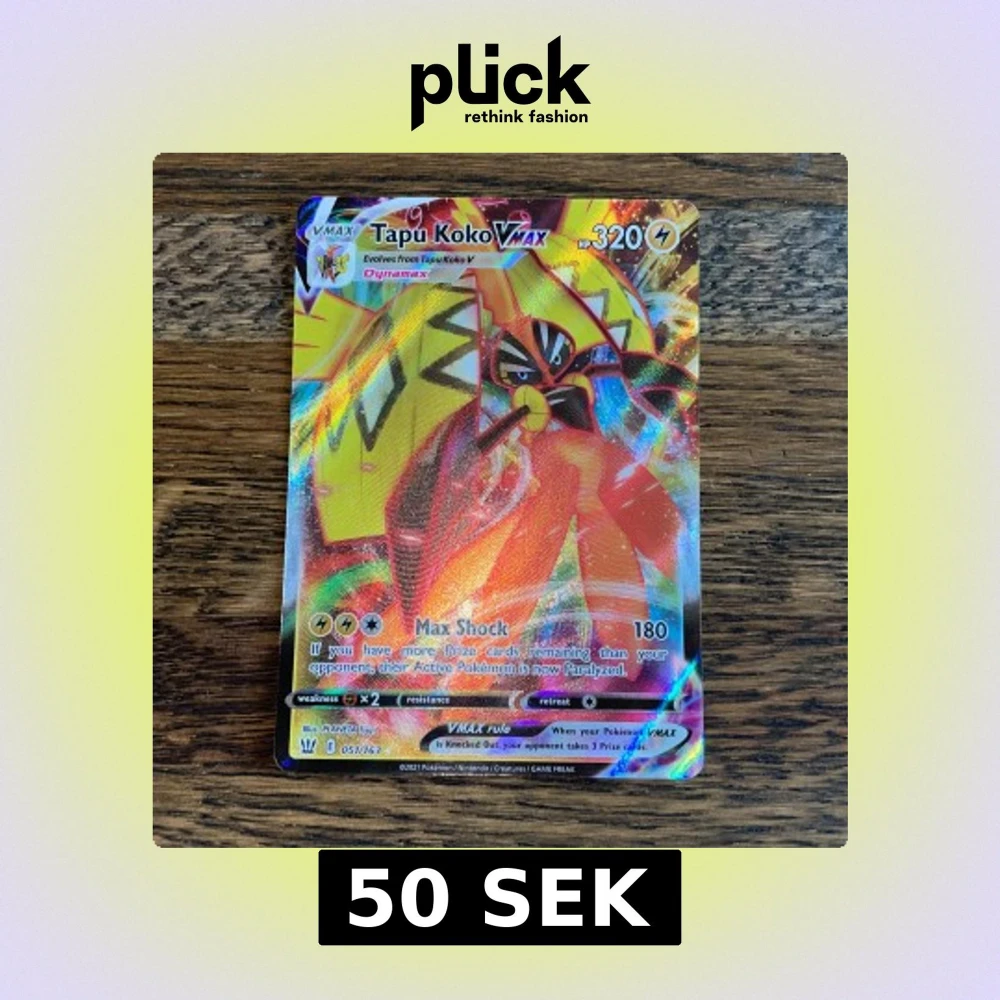 Coolt och glittrande Pokémonkort med Tapu Koko VMAX! Perfekt för samlare och Pokémon-fans som vill boosta sin lek med en kraftfull och färgstark VMAX. Kortet har 320 HP och en maxad design som sticker ut i samlingen.