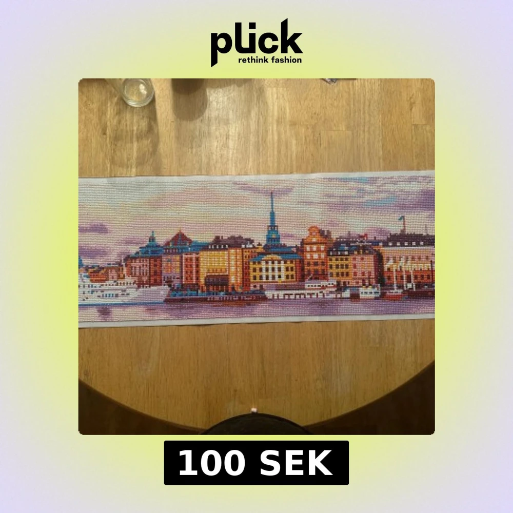 Säljer en färgglad diamond painting som föreställer Stockholms stadssilhuett med klassiska byggnader och båtar. Tavlan har många detaljer och skimrande stenar i olika färger, perfekt för att dekorera väggen med en unik touch.