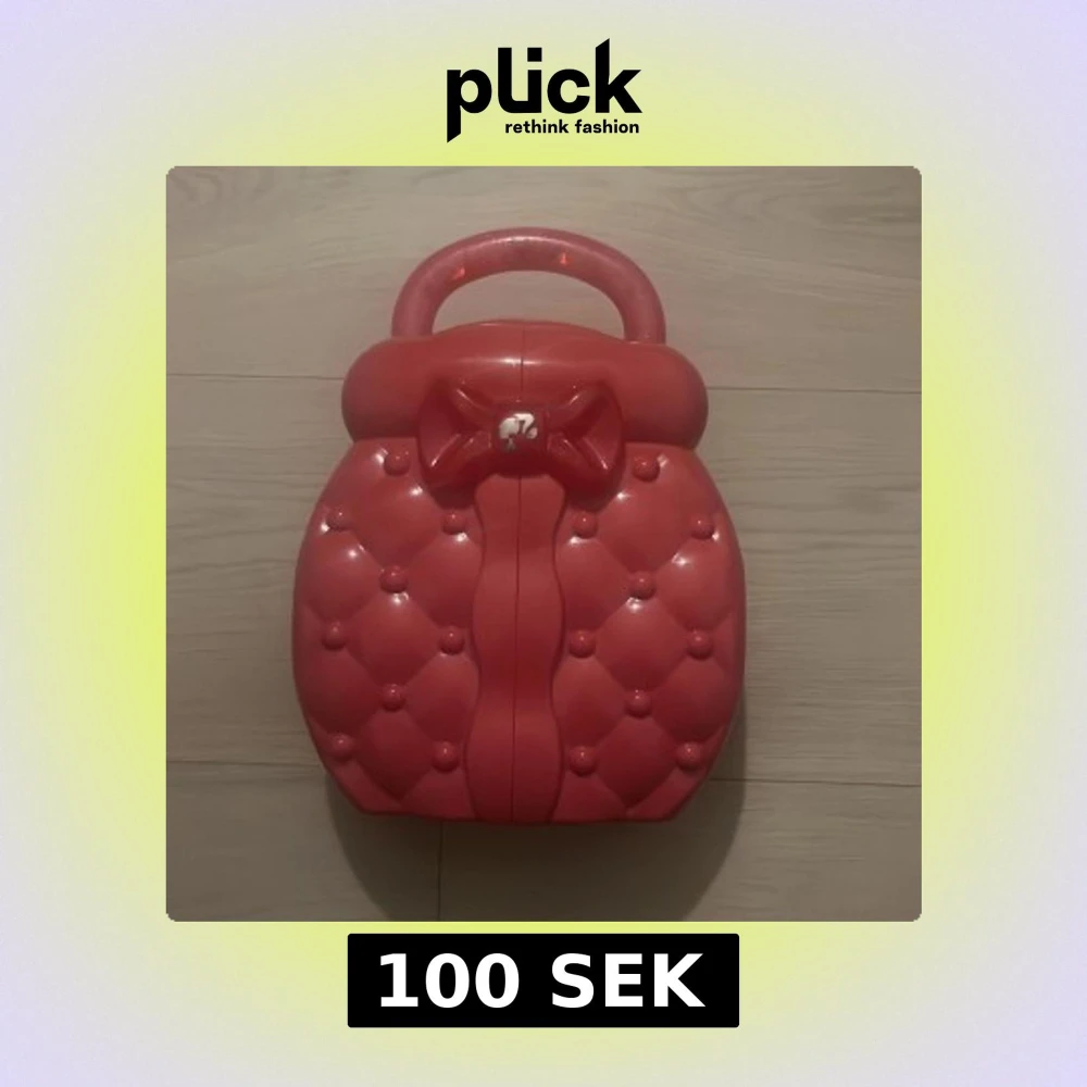 Säljer en Barbie handväska i stark rosa plast med quiltad look och stor rosett framtill. Väskan öppnas upp och har en vit oval spegel med rosa detaljer inuti, perfekt för smink eller småsaker. Väskan har ett rejält handtag och är riktigt söt och unik.
