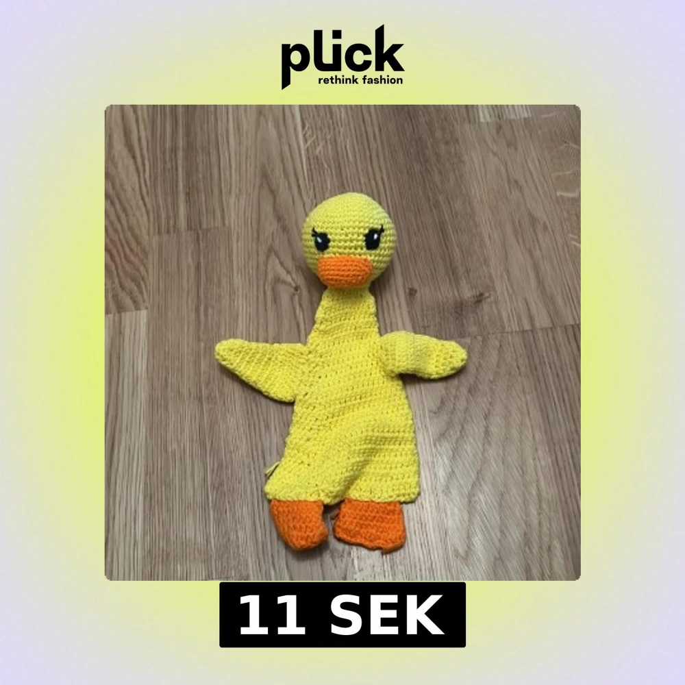 Charmig gul virkad anka med orange näbb och fötter. Perfekt som en söt dekoration eller leksak. Den har detaljerade ögon och är handgjord med kärlek.