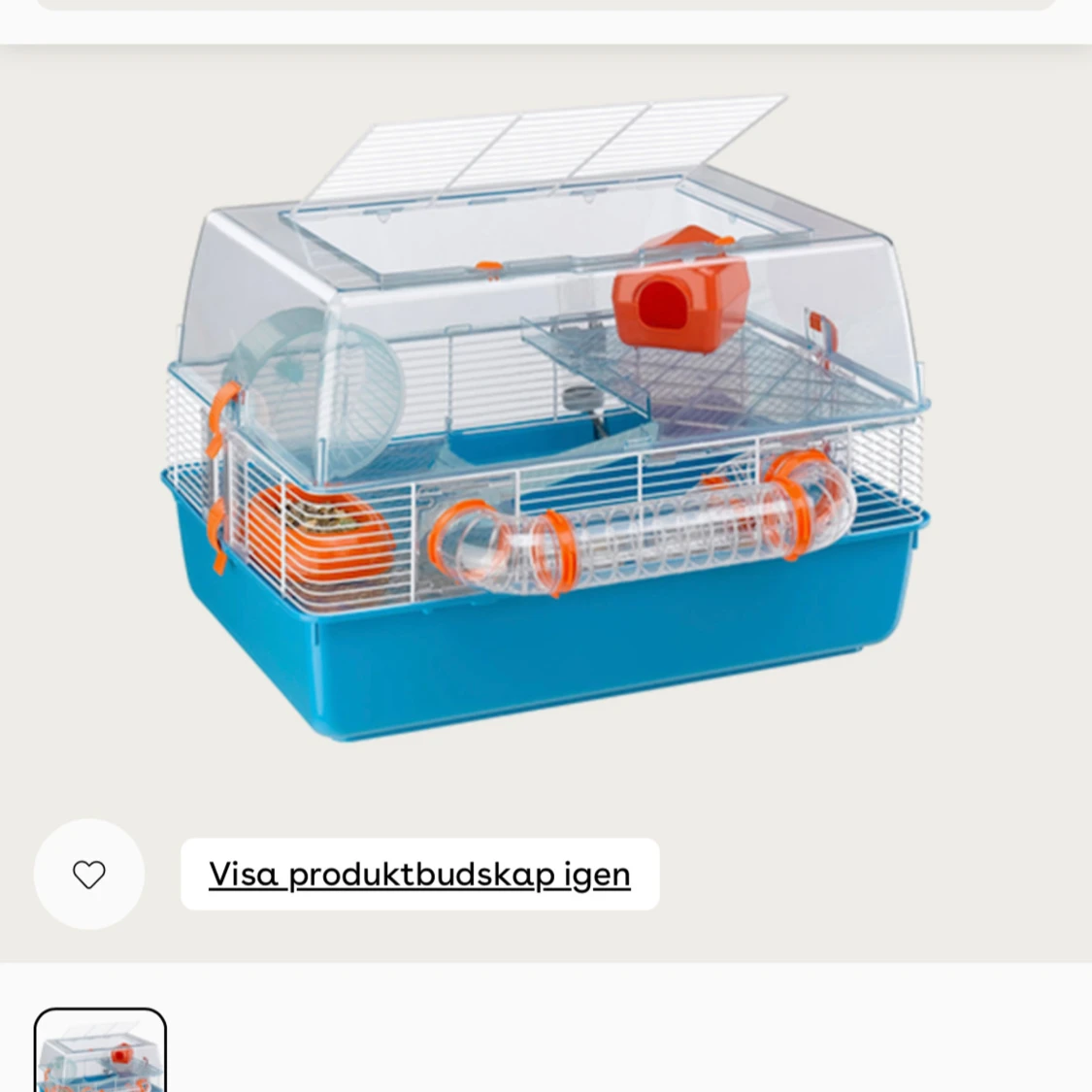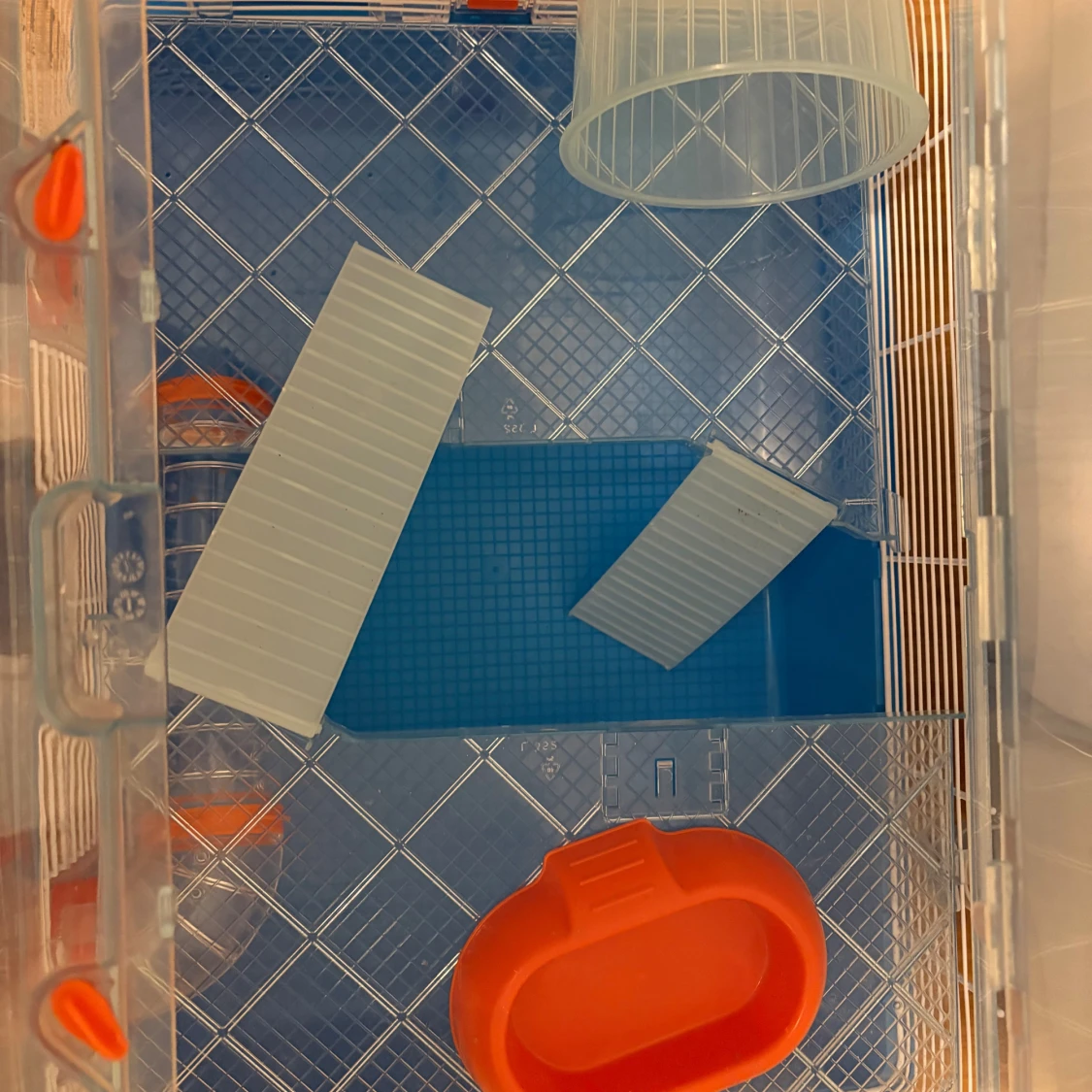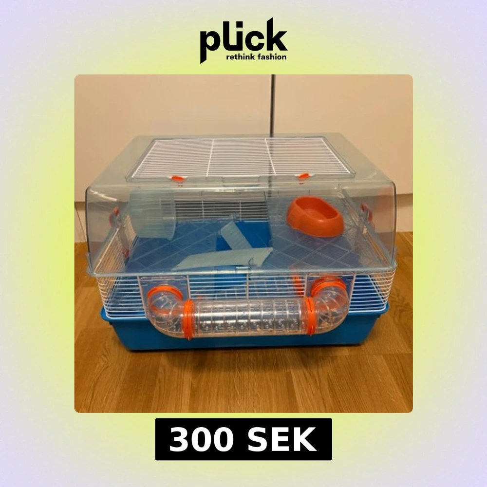 Praktisk hamsterbur med plasttunnel, hjul, ramp och matskål. Buren är rymlig och har god ventilation. Viss rost och slitage syns på gallret (se bild), men i övrigt i bra skick. Perfekt för små gnagare som behöver aktivitet och trygghet.