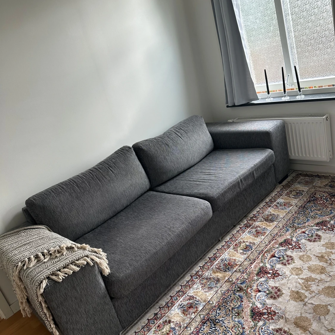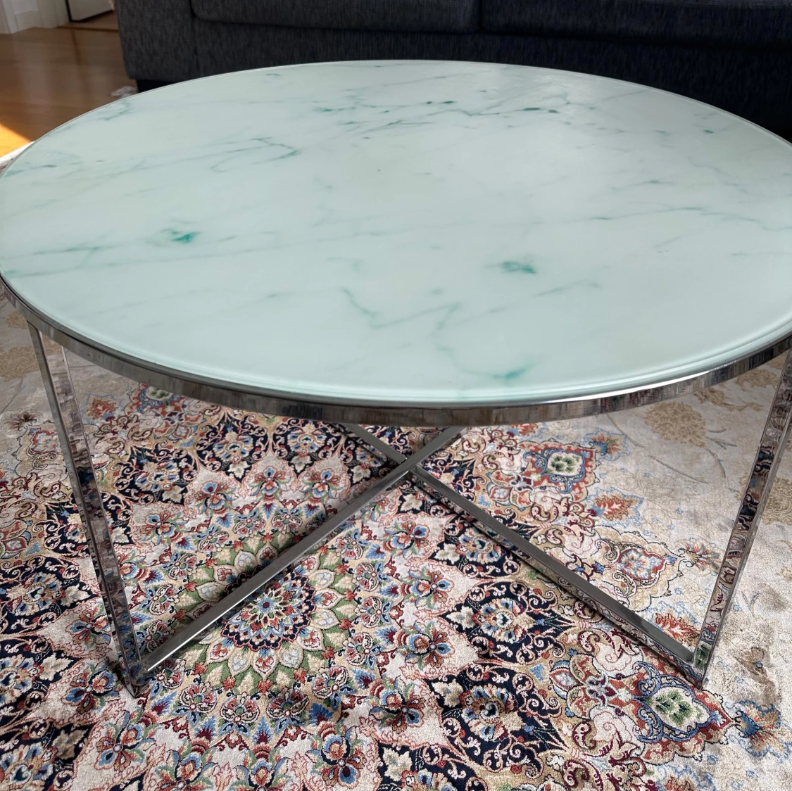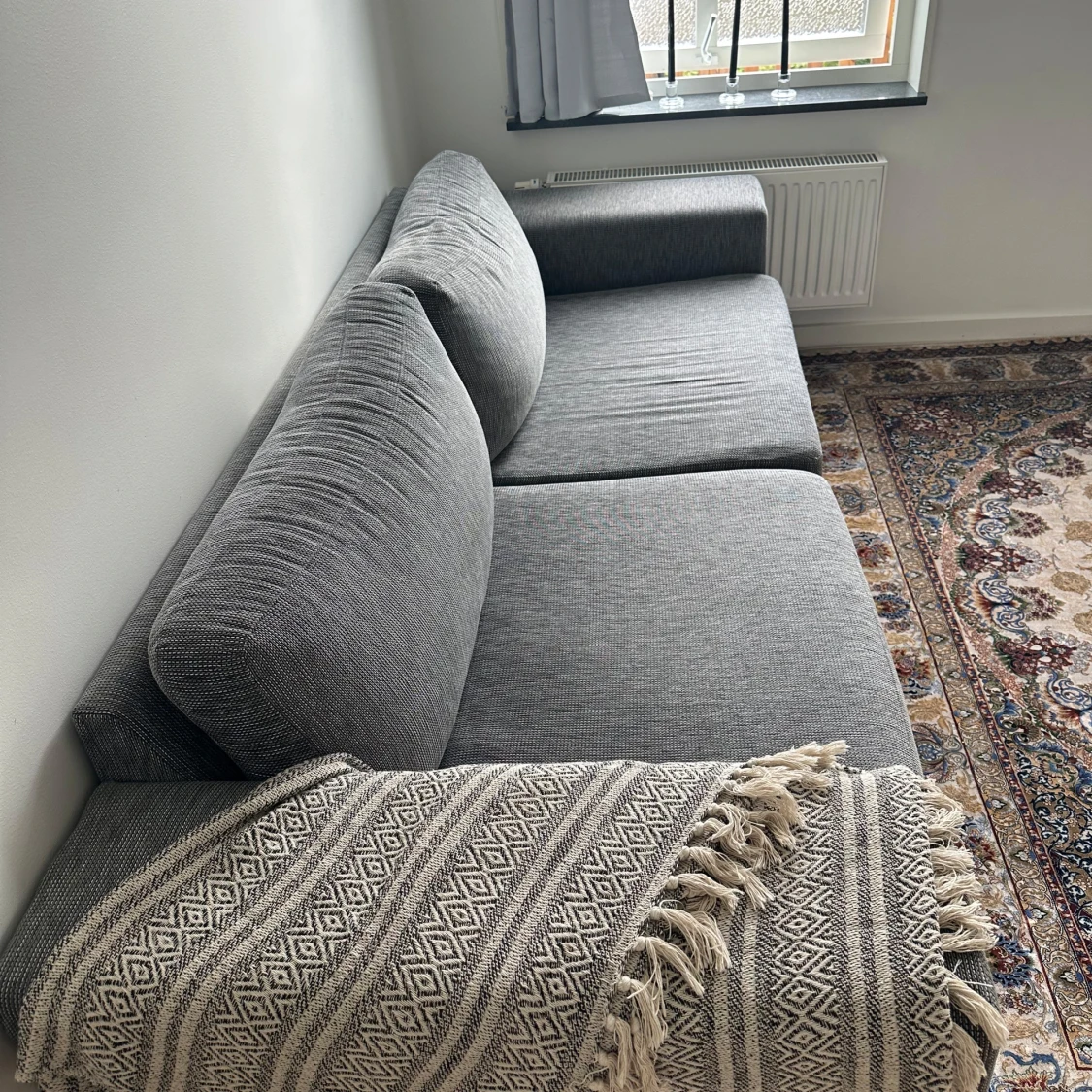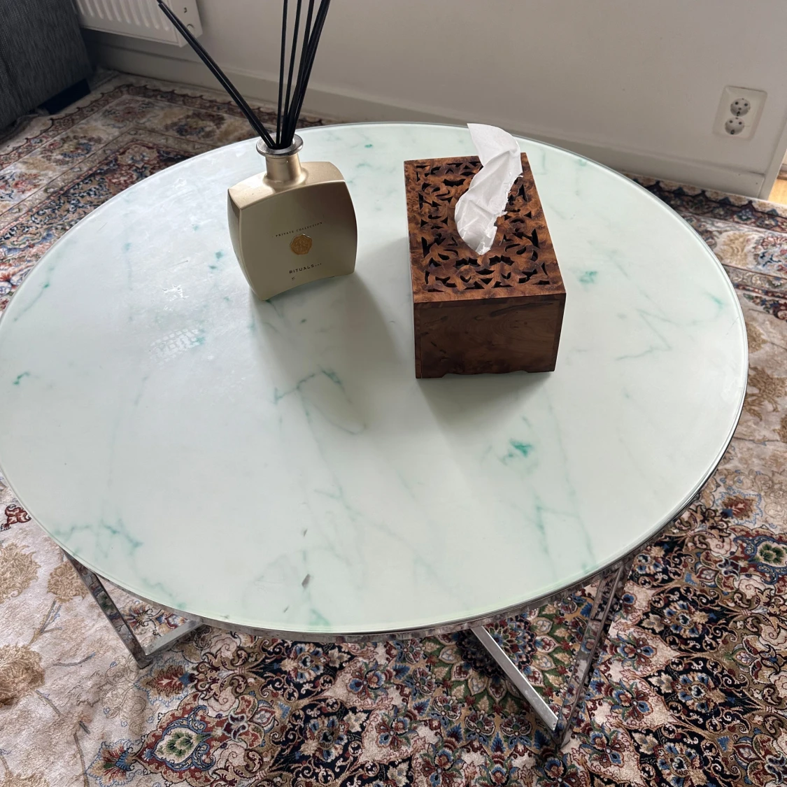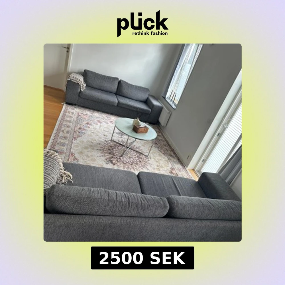Ingen bok syns på bilderna. Bilderna visar ett vardagsrum med grå soffor, ett marmorbord och en mönstrad matta.