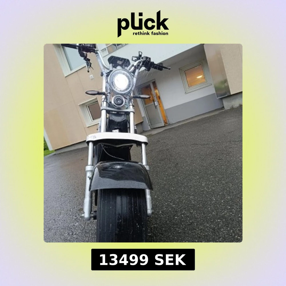 "Presentera den ultimata cykelturen – den helt nya, 2500-watts elcykeln! Byggd för hastighet, kraft och stil." [Närbild på cykelns ram, som framhäver den blanka svarta finishen. En ryttare lyfter cykeln från stället.] "Med en slående, helt svart design kombinerar denna skönhet banbrytande teknik med oöverträffad design." "Känn kraften från en 2500-watts motor som tar dig längre, snabbare – utan att svettas." "Ingen bensin, bara elektrisk kraft – och du kan ladda den var som helst, när som helst.
