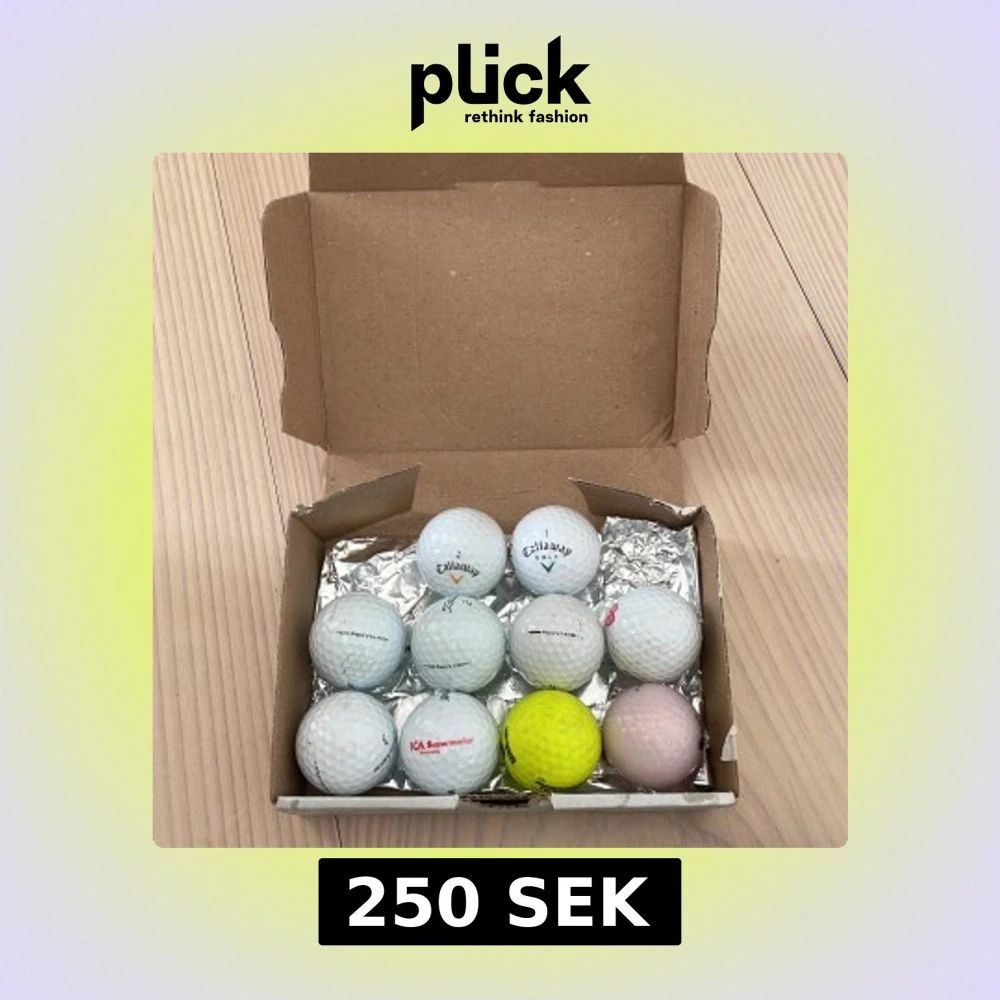 Säljer ett paket med tio blandade golfbollar i olika färger och märken. Flera är vita, en är gul och en är ljusrosa. Några bollar har tryck från Callaway och ICA Supermarket. Perfekt för dig som vill fylla på golfbagen med extra bollar.