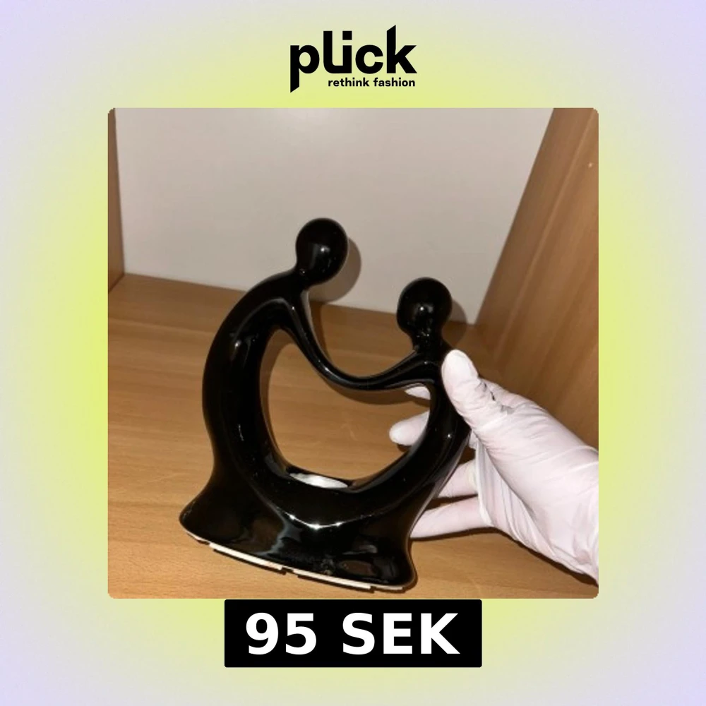 Bilderna visar en dekorativ ljushållare i svart keramik, formad som två stiliserade figurer som håller varandra. Produkten har plats för ett värmeljus i mitten. Ytan ser blank och välvårdad ut, utan synliga skador eller slitage. Perfekt som prydnad eller mysig belysning i hemmet.En dekorativ ljusstake i svart keramik. Perfekt som inredningsdetalj.