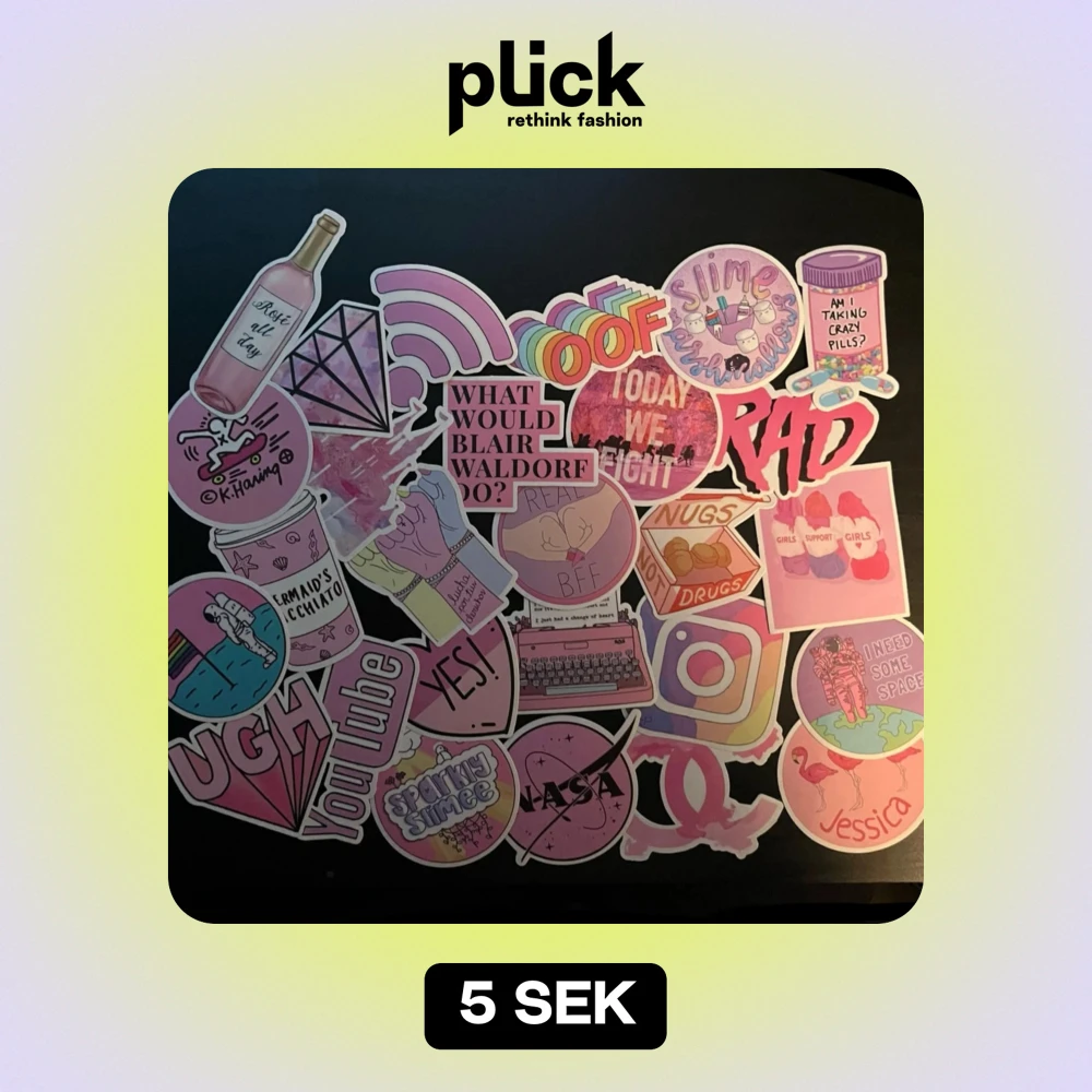 Ett gäng klistermärken i olika rosa och lila nyanser med roliga och sarkastiska texter och bilder. Perfekt för att dekorera laptops, anteckningsböcker eller telefoner. Innehåller populärkulturella referenser och humoristiska citat.