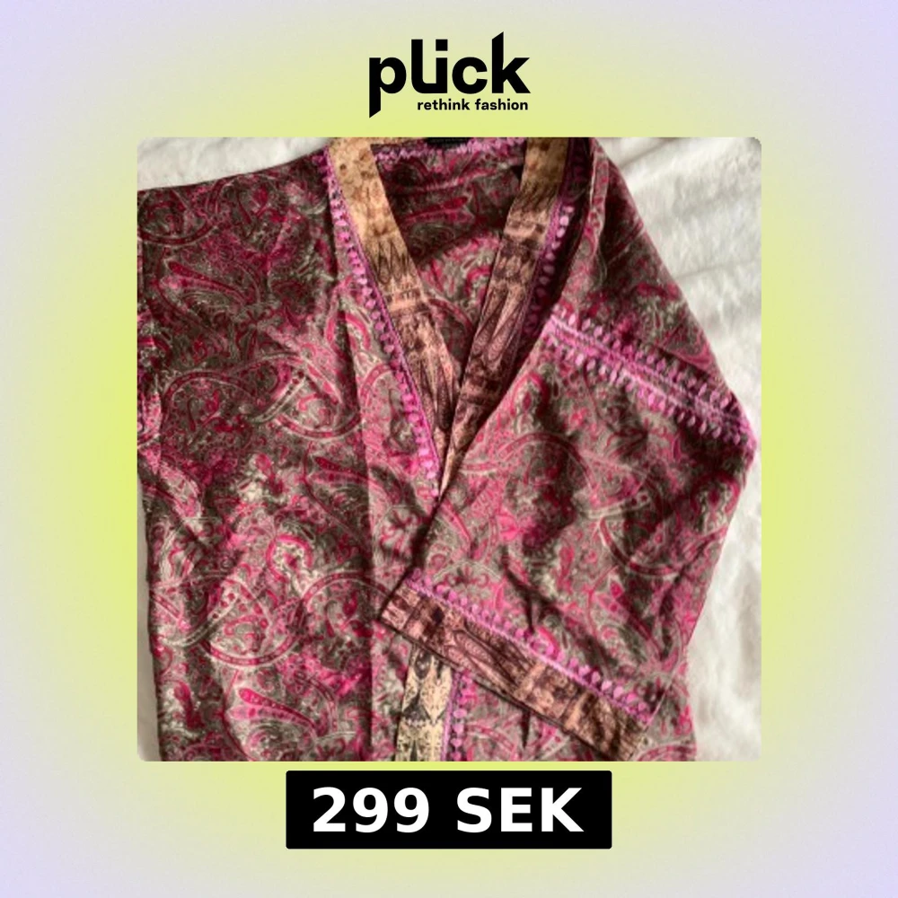 Paisleymönstrad kimono i rosa och beige toner med inslag av brunt. Kimonon har v-ringning, dekorativa band och detaljer i kontrasterande mönster längs kanterna. Lätt material och avslappnad passform, perfekt för dig som gillar boho-vibes. Nypris 800.