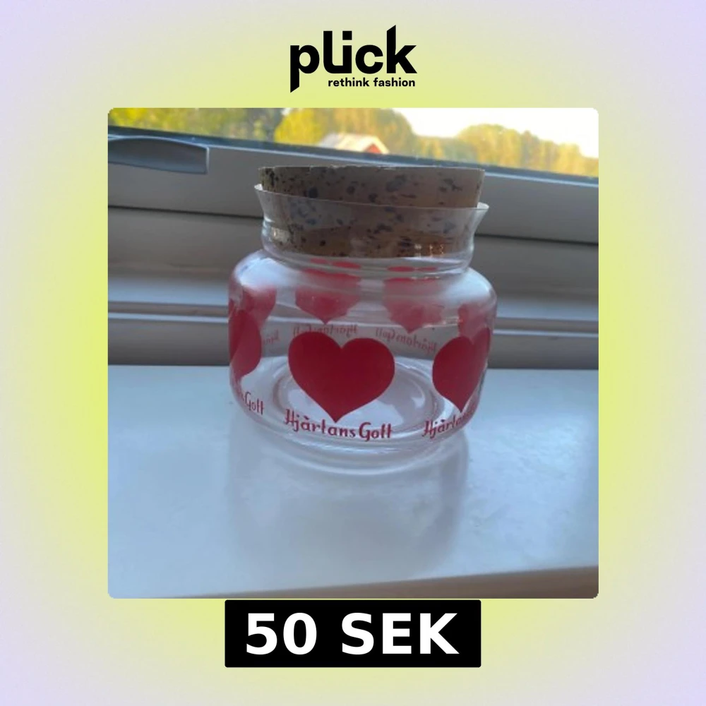 Bilderna visar en glasburk med korklock, dekorerad med röda hjärtan och texten 'Hjärtans Gott'. Burken är tillverkad av SEA Glasbruk, Kosta, Sweden. Perfekt som kak eller godis burk och att lägga egen gjort godis i mm