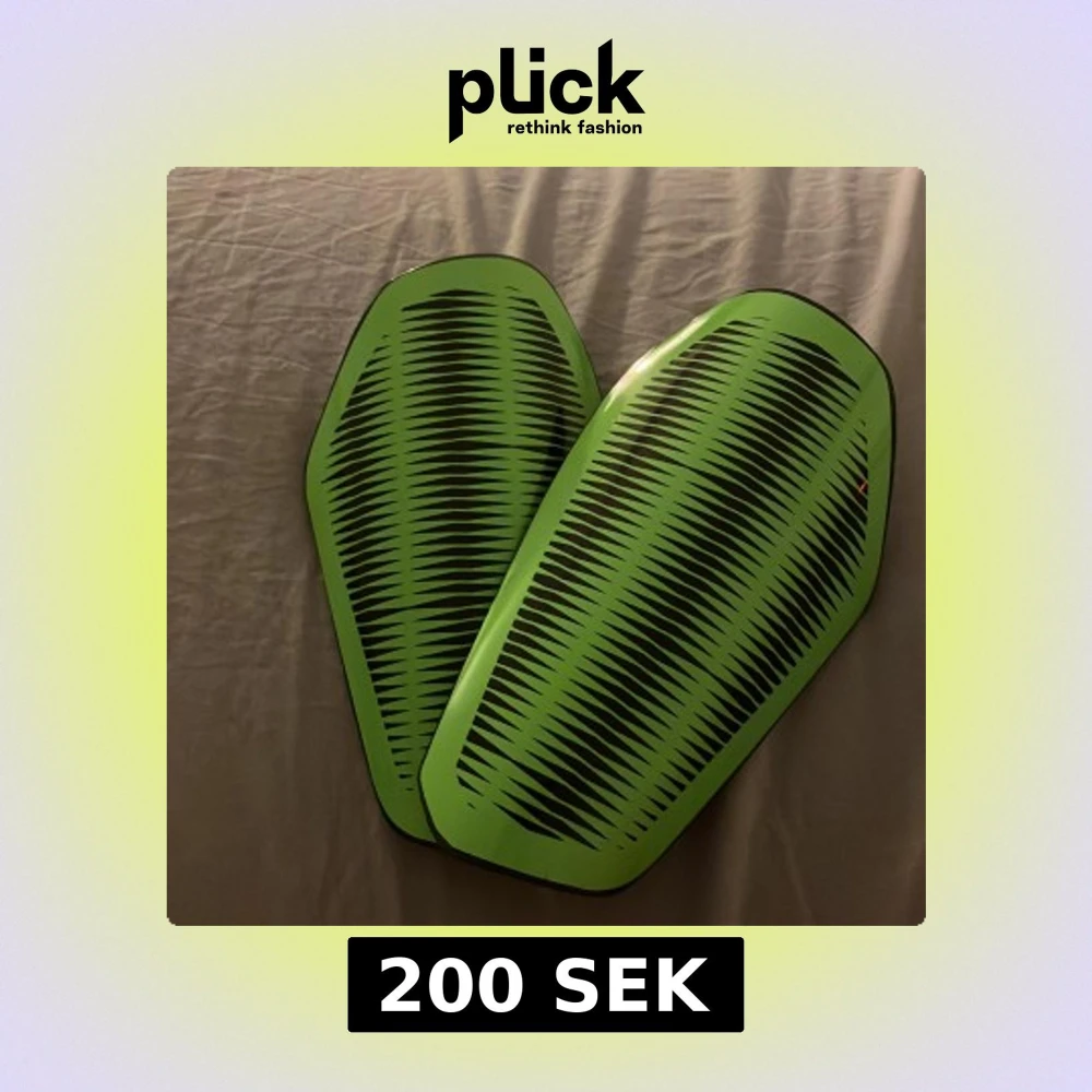 Säljer ett par benskydd i cool grön färg med svart grafiskt mönster på utsidan. Insidan är svart med hål för ventilation. De är tillverkade i slitstark plast och har en modern, sportig form som passar perfekt för fotbollsträning och match. Inte använd mycket alls. Passar på en 13-åring