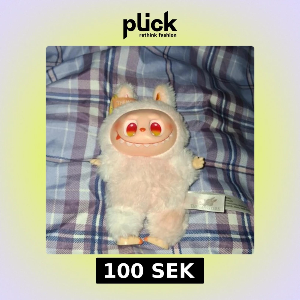 Bilderna visar en söt och unik mjukisdocka med lurvig vit päls och ett glatt ansikte med röda ögon. Dockan har plastfötter och händer, samt etiketten 'THE MONSTERS'. Baksidan har en lätt rosa missfärgning. Passar samlare eller som present. Inga synliga elektronikfunktioner.