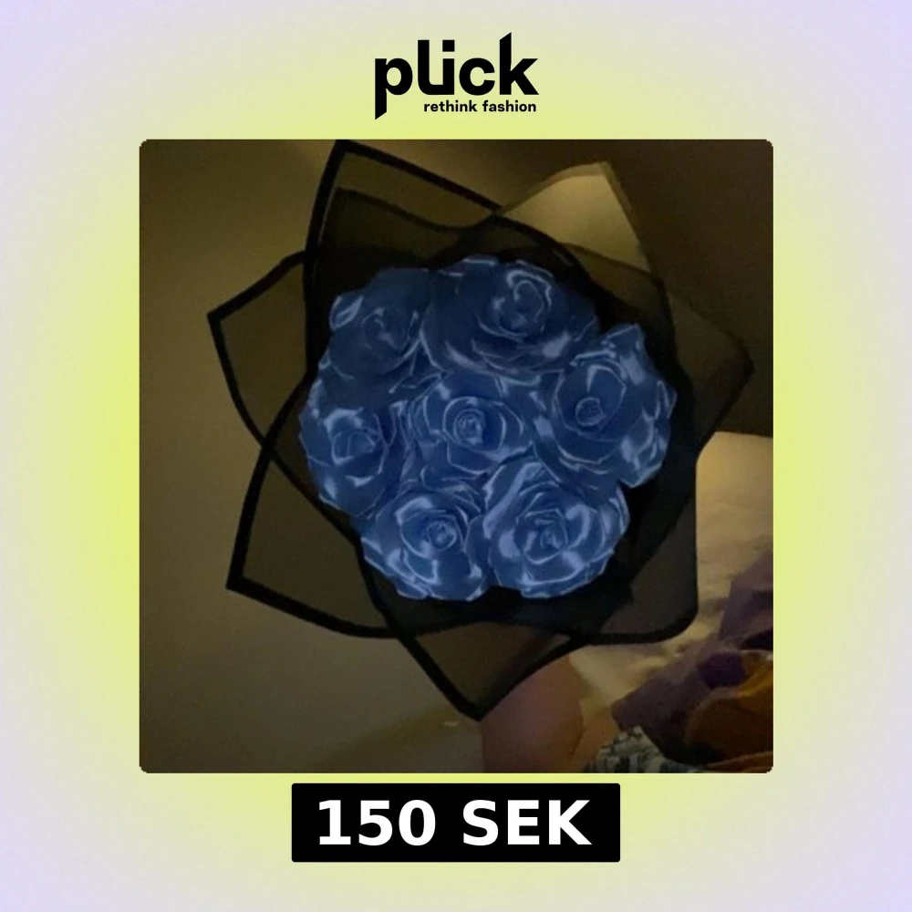 Säljer en snygg bukett med konstgjorda blå rosor, inslagna i svart transparent papper och dekorerad med ett blått band. Perfekt som present eller dekoration.