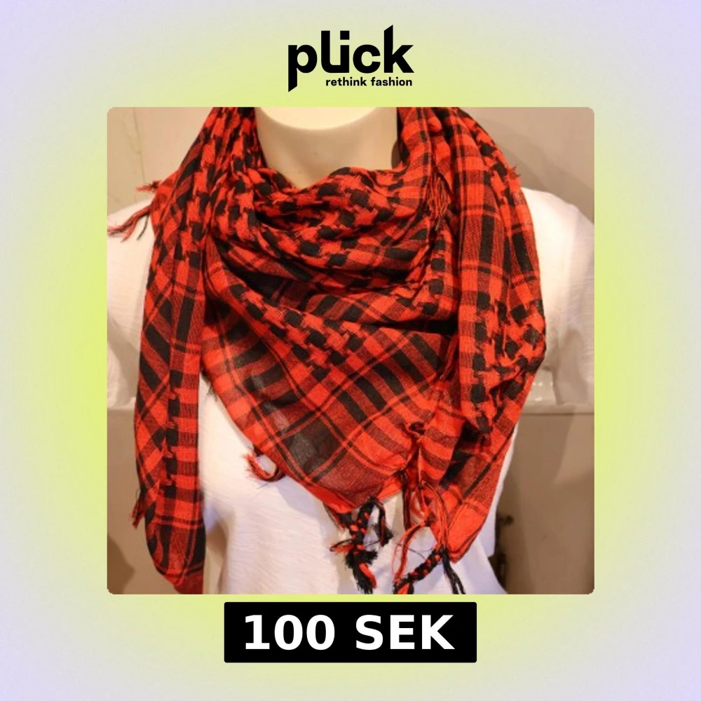 Säljer en röd och svart rutig halsduk med klassiskt mönster och fransar i kanterna. Perfekt accessoar för att ge din outfit lite edge och värme. Halsduken är mjuk och lätt att styla på olika sätt.