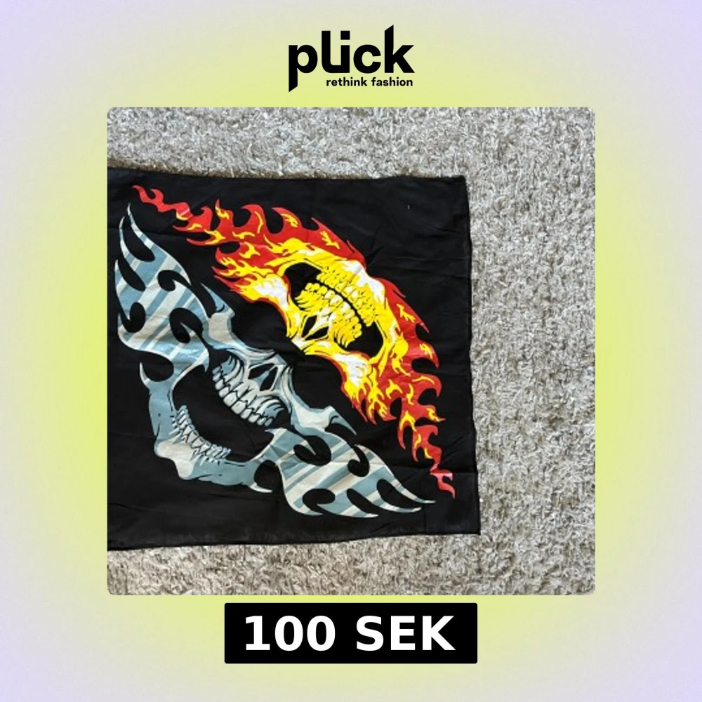 Cool svart halsduk med stort tryck av en dödskalle i grått och vitt, omgiven av eldflammor i rött, gult och orange. Perfekt för dig som gillar tuffa accessoarer och vill sticka ut. Bomull. Mått 50 x 50 cm. Helt ny.