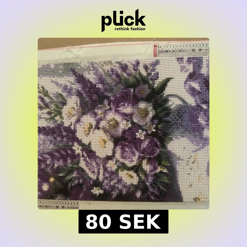 En Diamond Painting tavla med vackert blommotiv i lila, vitt och grönt.