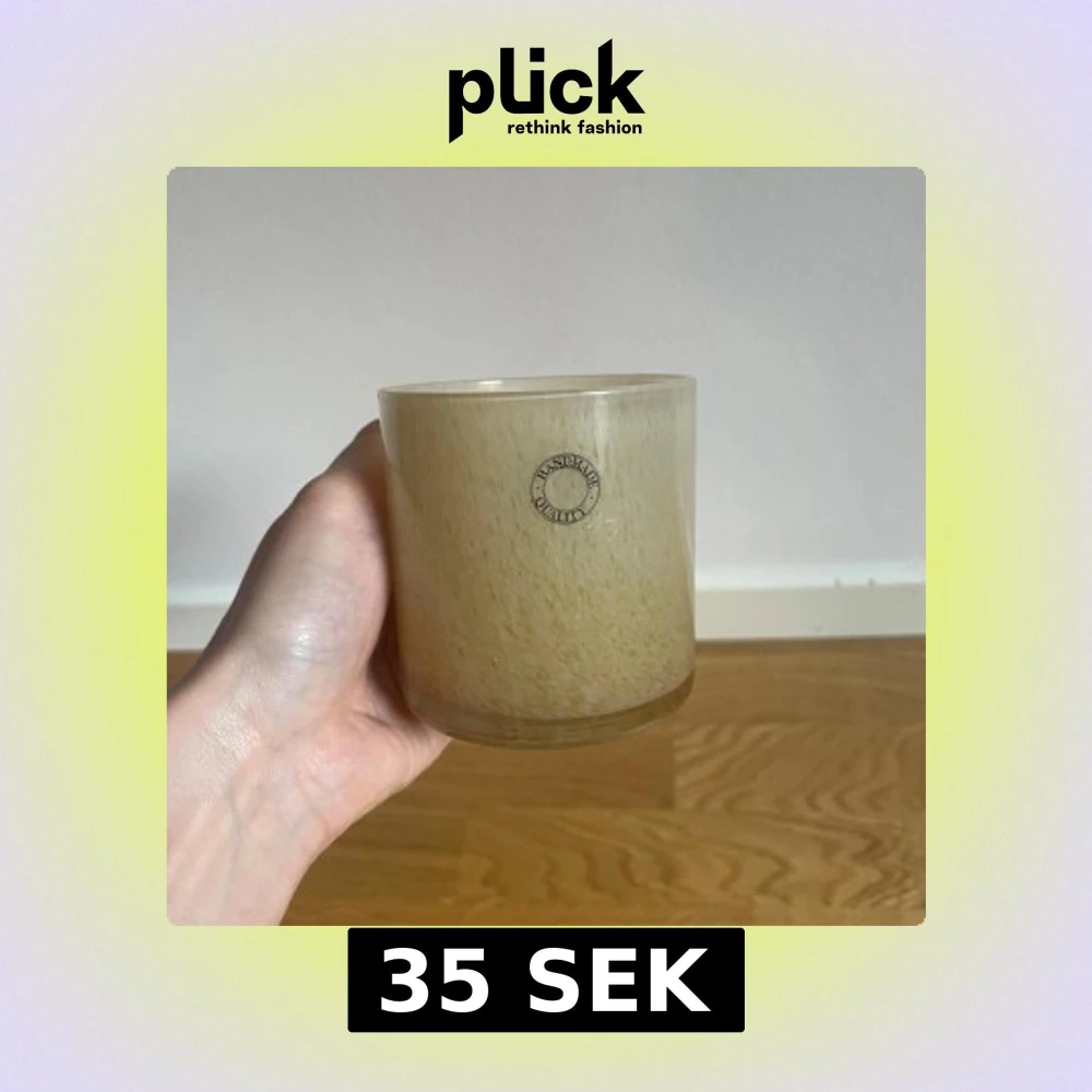 Säljer ett stilrent ljushållare i glas med en rund etikett på framsidan. Perfekt för att skapa en mysig atmosfär hemma. Glaset har en mjuk, naturlig ton som passar in i de flesta inredningar.