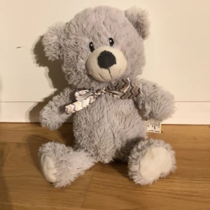 Söt och fluffig grå nallebjörn med en mönstrad rosett runt halsen. Den har stora svarta ögon och en mjuk nos. Perfekt som en mysig kompis eller dekoration.