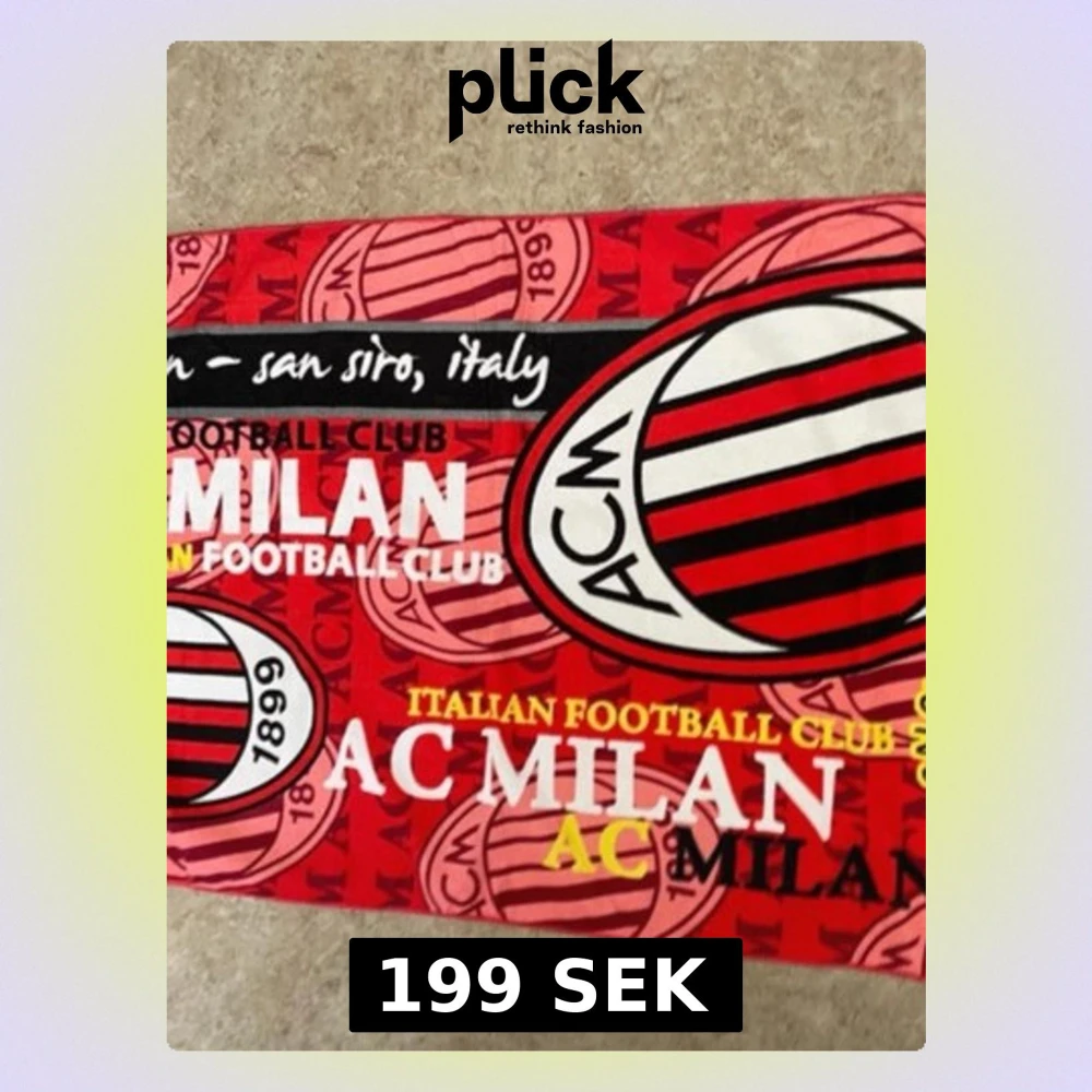 Säljer en röd väst med AC Milan-tryck och stora klubbemblem. Västen har svart och vit randigt mönster, samt detaljer i gult och rosa. Perfekt för dig som älskar fotboll och vill visa ditt stöd för Milan. Materialet är troligtvis polyester.