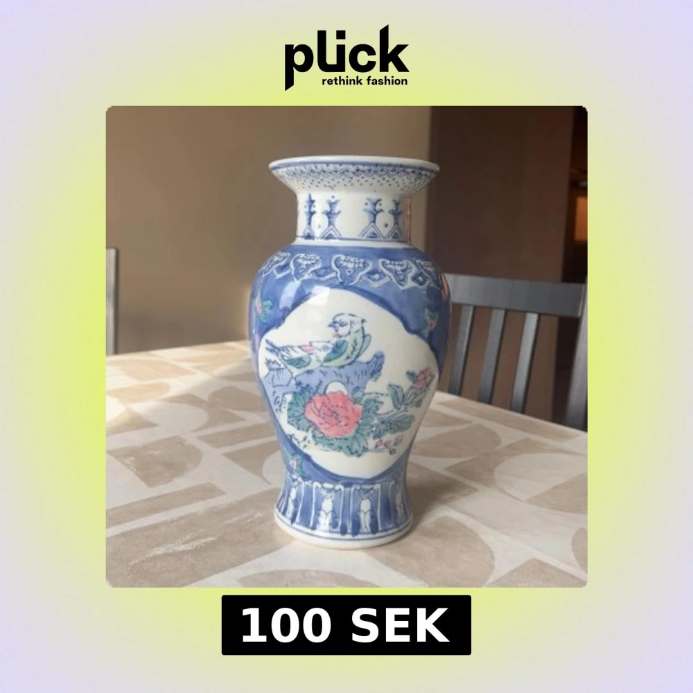 Vacker blåvit vas med detaljerade motiv av fåglar och blommor. Vasen har en elegant form med en bred öppning och dekorativa mönster runt om. Perfekt som en stilfull inredningsdetalj.