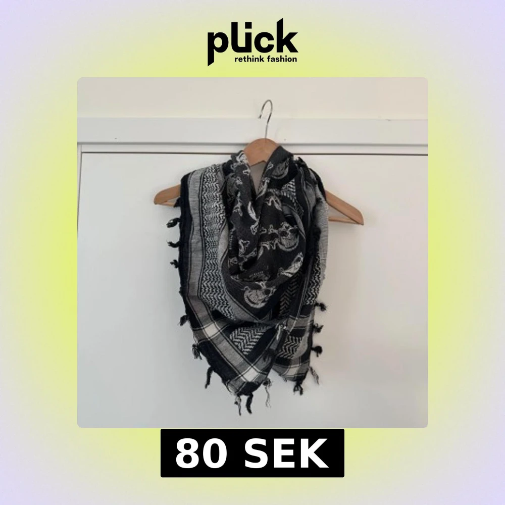 Snygg svart och vit sjal / scarf / halsduk med ett coolt dödskallemönster. Den har fransar längs kanterna och ett rutigt mönster som ger en extra touch. Perfekt för att ge din outfit en edgy stil.