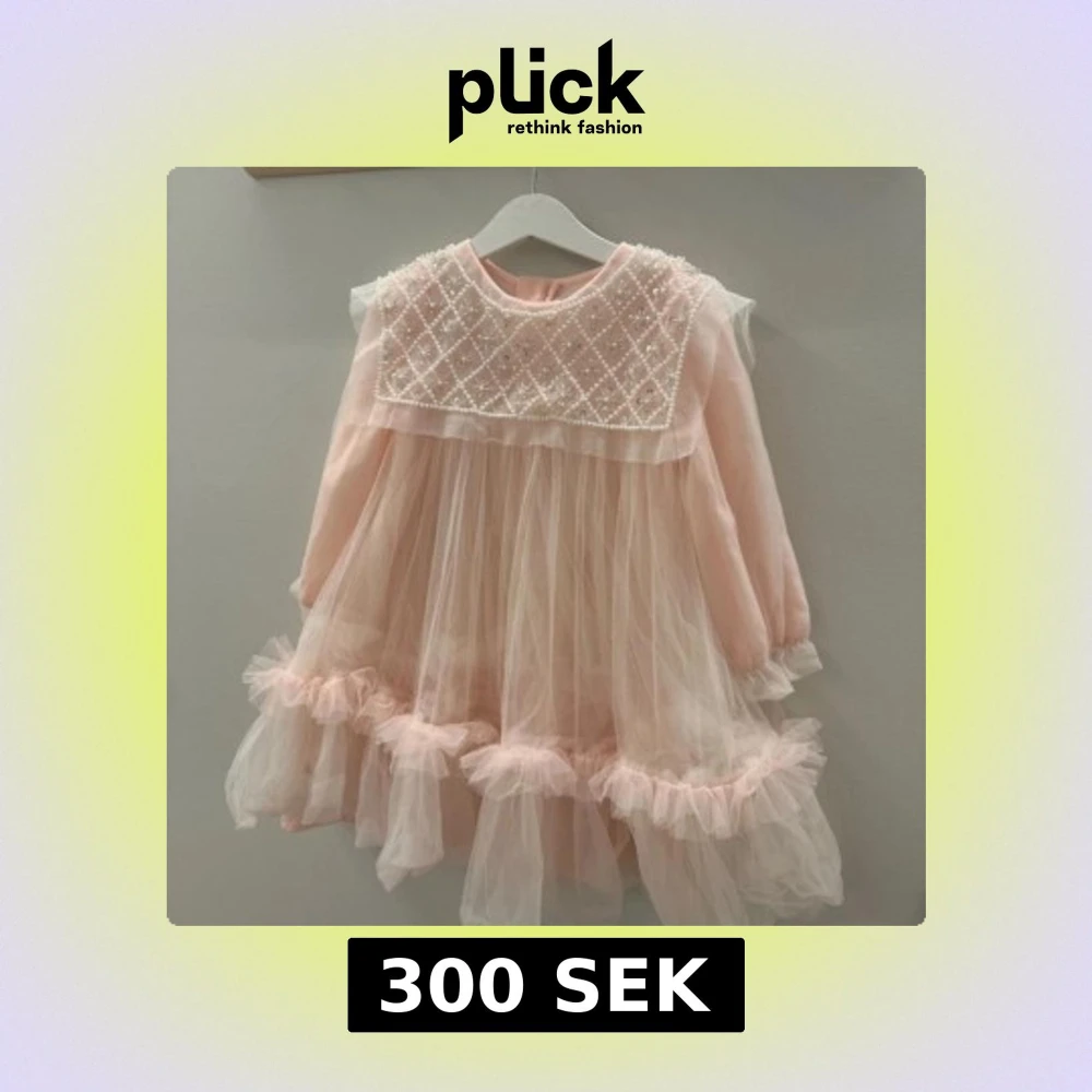 Söt rosa klänning med volanger och pärldetaljer på bröstet. Den har långa ärmar och en luftig, flödande design som ger en drömlik känsla. Perfekt för speciella tillfällen.