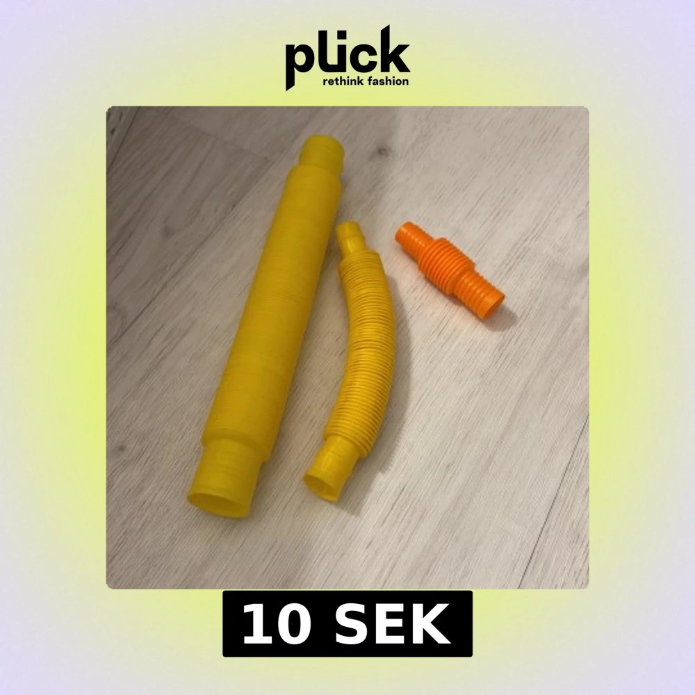 Bilderna visar färgglada plastleksaker, troligen s.k. pop tubes, som kan böjas och dras ut för att skapa olika former och ljud. De är i gult och orange och ser ut att vara i gott skick utan synligt slitage. Perfekt för sensorisk lek och kreativitet för barn.