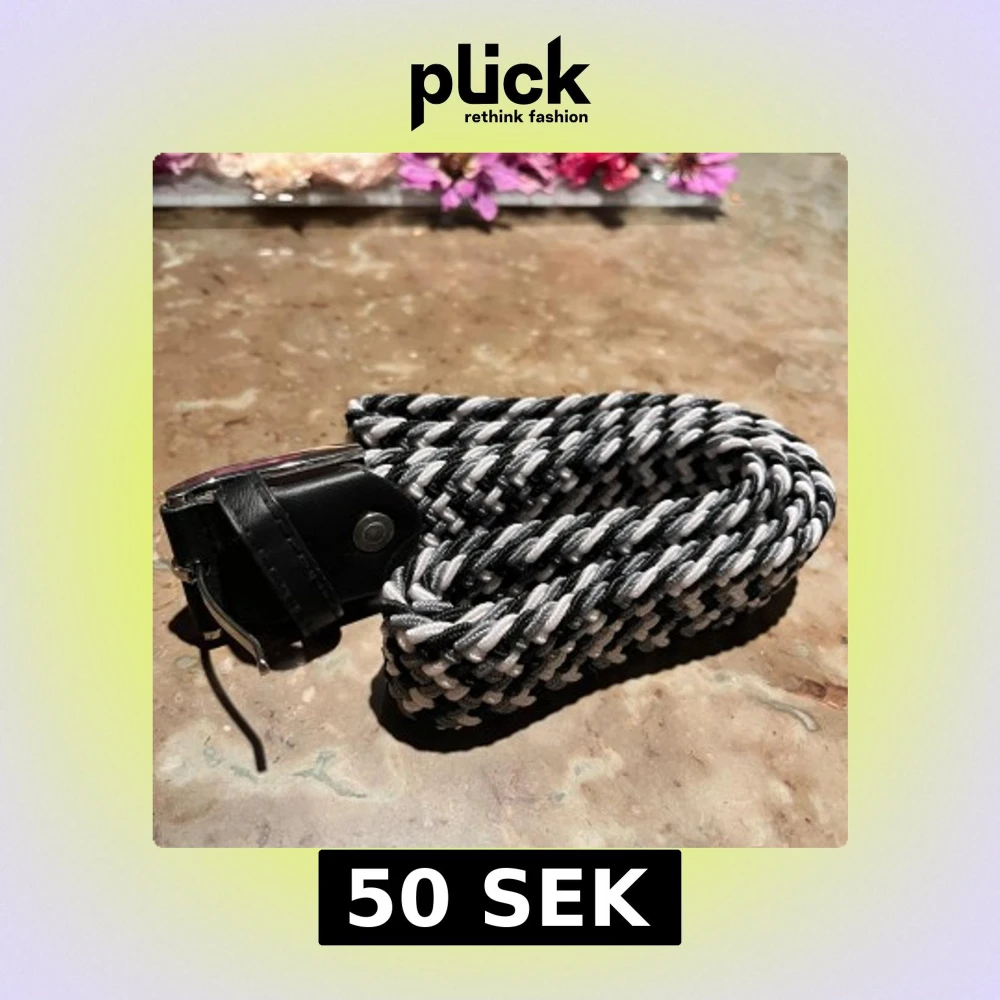 Säljer ett snyggt flätat bälte i svart och vitt med silverfärgat spänne. Bältet är 120 cm långt inklusive allt.